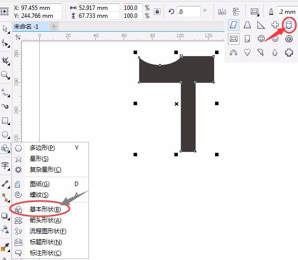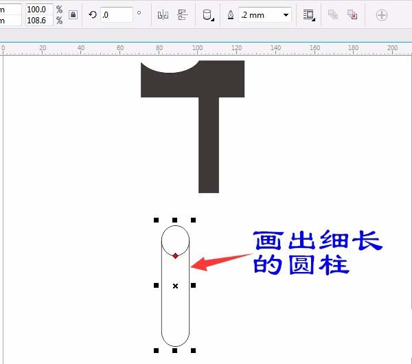 6、单击选“基本形状”,属性栏中选圆柱基本形状,画出细长的圆柱,如图: