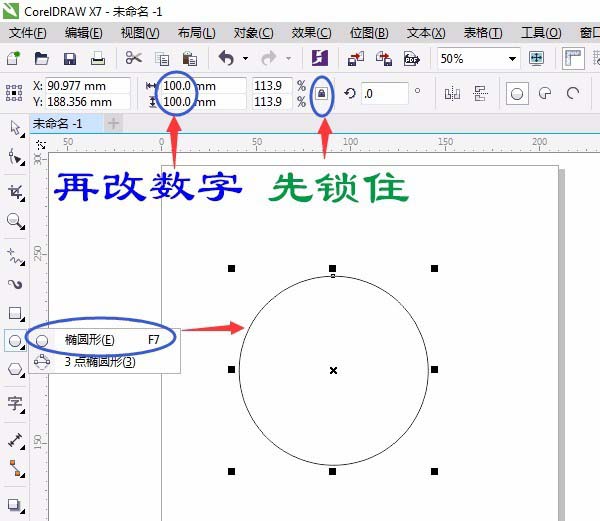 1、单击用“椭圆形工具”按Ctrl键画一个正圆,并在“属性栏”中改为(对准数字双击只改数字即可)100,如图所示: