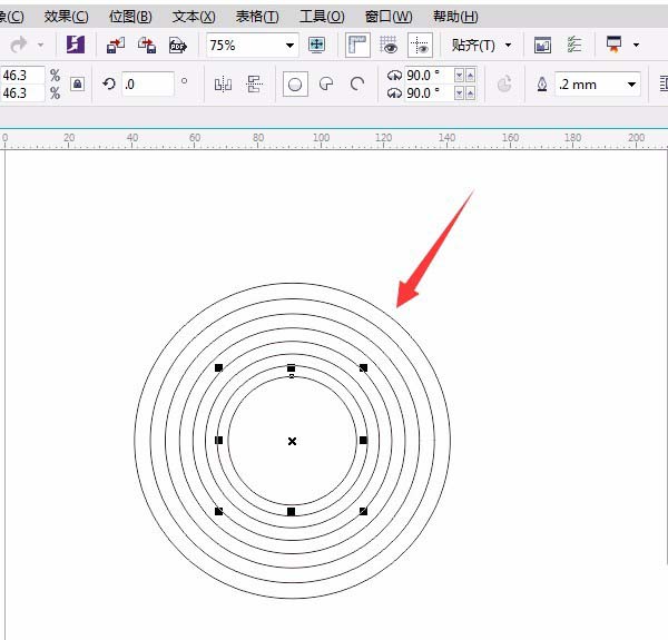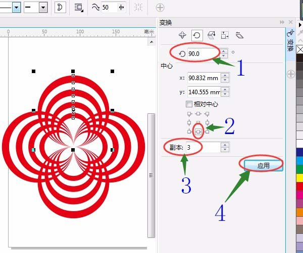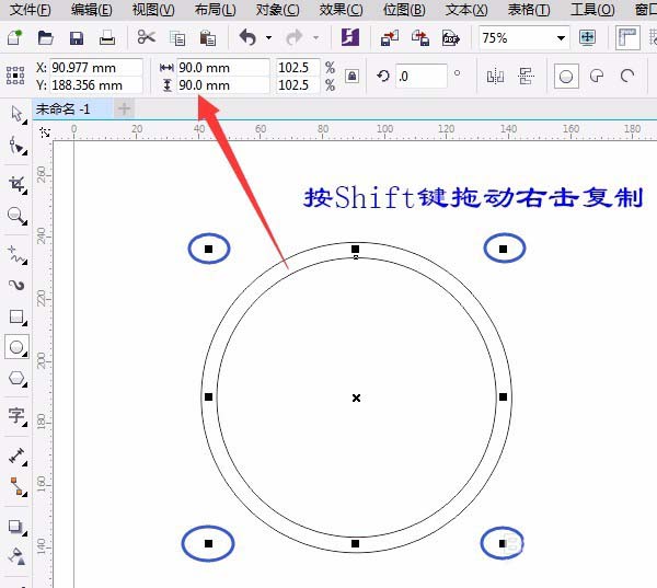 2、复制正圆:四个角的小方框任一个按Shift键往里拖动变小右击复制,并在“属性栏”中改为90,如图所示: