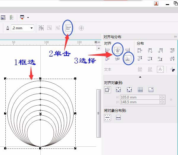 4、用“选择工具”(按空格键即可切换为选择工具)框选所有图形,单击选择属性栏中的“对齐与分布”:选“水平居中对齐”和“底部对齐”或单击“对象”菜单→对齐和分布→选对齐方式。如图: