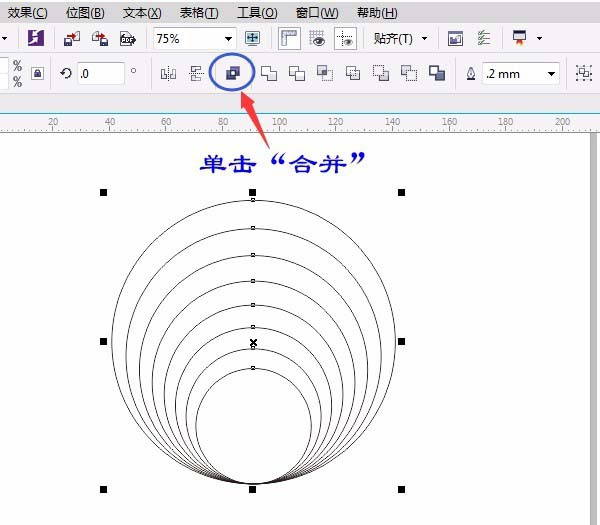 5、用“选择工具”(按空格键即可切换为选择工具)框选所有图形,单击属性栏中单击“合并”,如图所示: