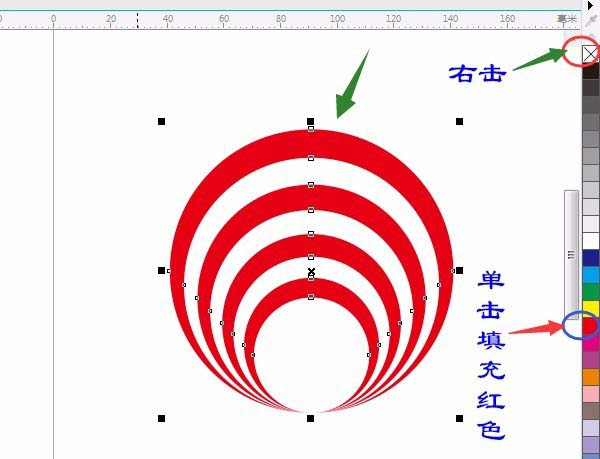 6、单击“调色板”填充红色,外部线条为无,右击调色板最上面的工具×,结果如图: