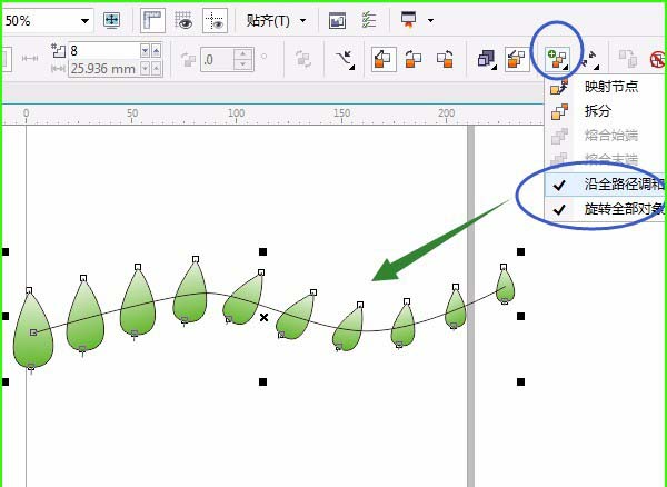 5、按空格键后单击中间的任一树叶,属性栏中选鼠标形状变弯曲箭头时单击路径,如图:
