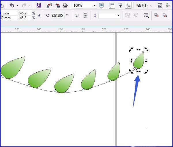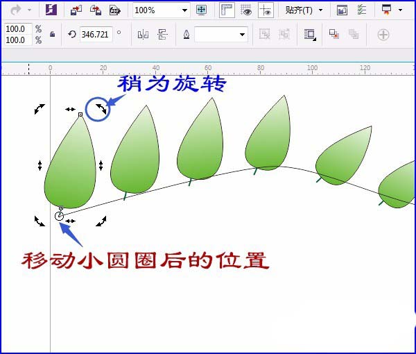 6、先在树叶以外单击鼠标,再单击两次第一个树叶,对准小圆圈处按住鼠标往下移动,旋转,右边的最后一个树叶一样操作方法,如图: