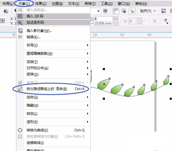 7、框选所有对象,单击“对象”菜单→拆分路径群组上的混合,选第一个树叶复制并镜像和选最后一个树叶复制并镜像,如图: