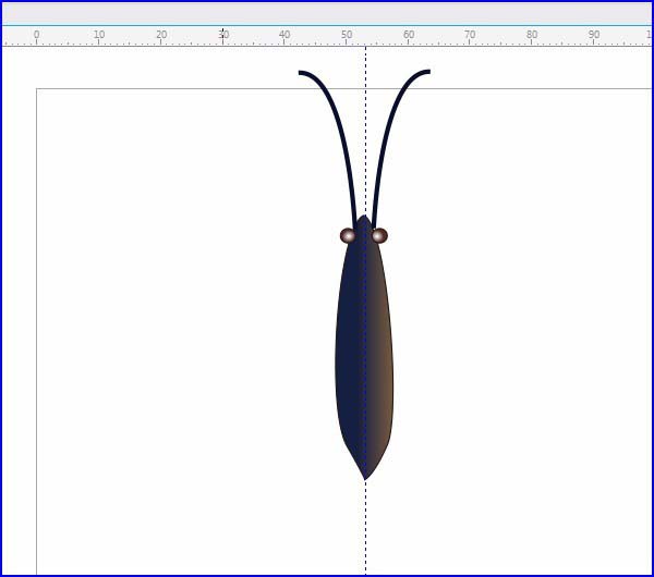1、用“贝塞尔工具”、“椭圆形工具”画出蝴蝶中间部分,可拉出辅助线,用“形状工具”调整,并用“交互式填充工具”渐变效果,如图所示: