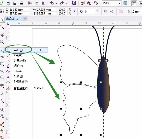 2、用“手绘工具”并双击修改平滑度,画出一边蝴蝶翅膀,必须是闭合的路径,并用“形状工具”调整。