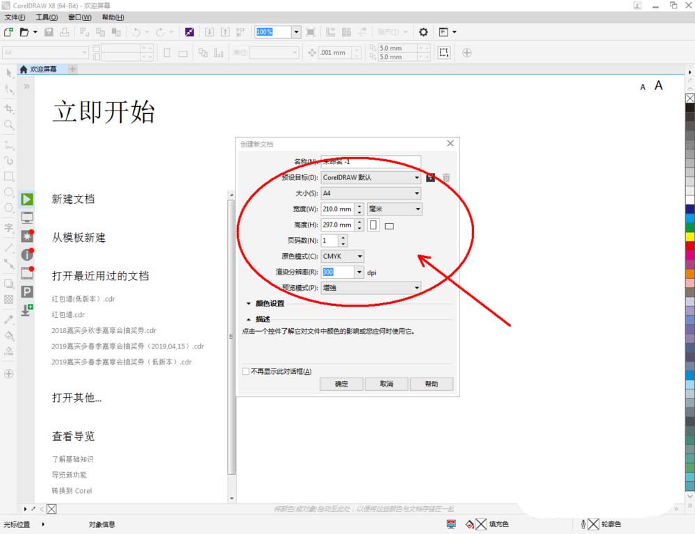 1、打开CorelDRAW X8 软件,点击【新建文档】,按图示参数新建一个cdr文档(如图所示);