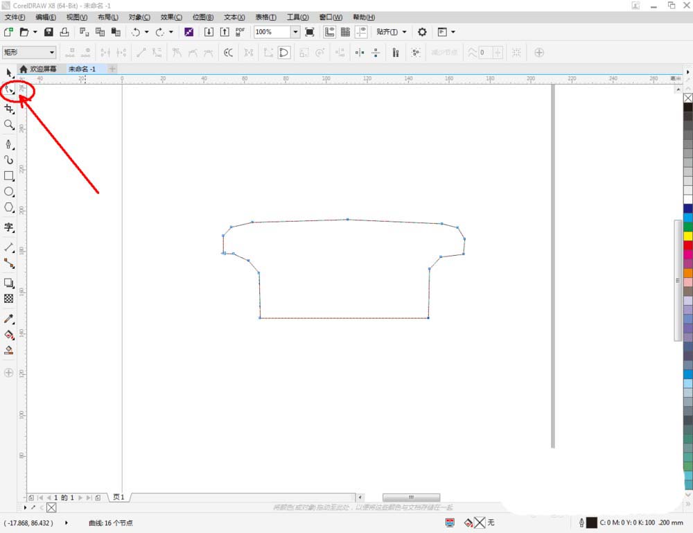 2、点击【钢笔工具】按图示在作图区域绘制出一个多边图案。点击【形状工具】,框选所有的节点后,点击【转化为曲线】将节点转曲。完成后,选中图示图案上的节点,点击【平滑节点】将节点进行平滑处理并调整好控制点(如图所示);