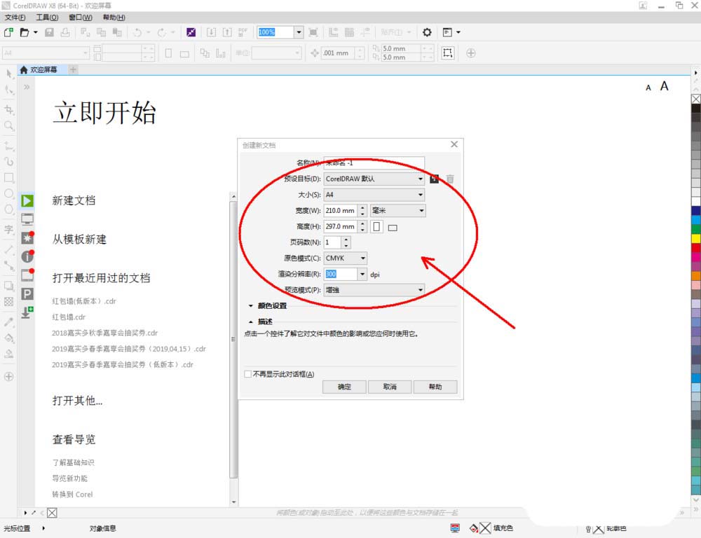1、打开CorelDRAW X8 软件,点击【新建文档】,按图示参数新建一个cdr文档(如图所示);
