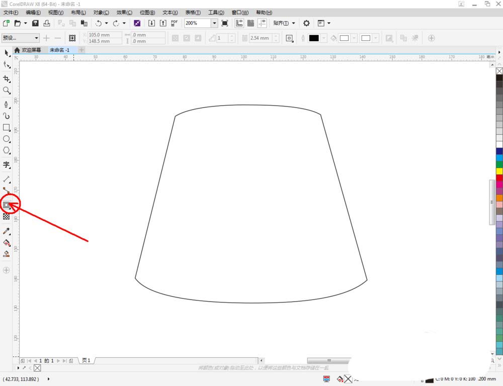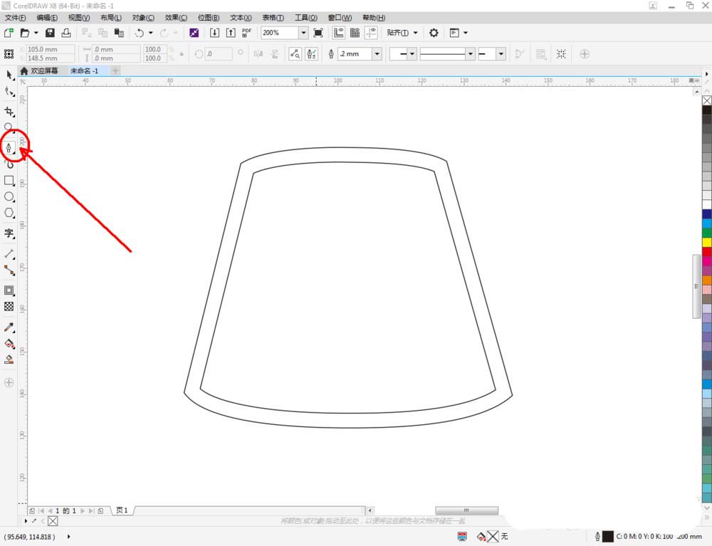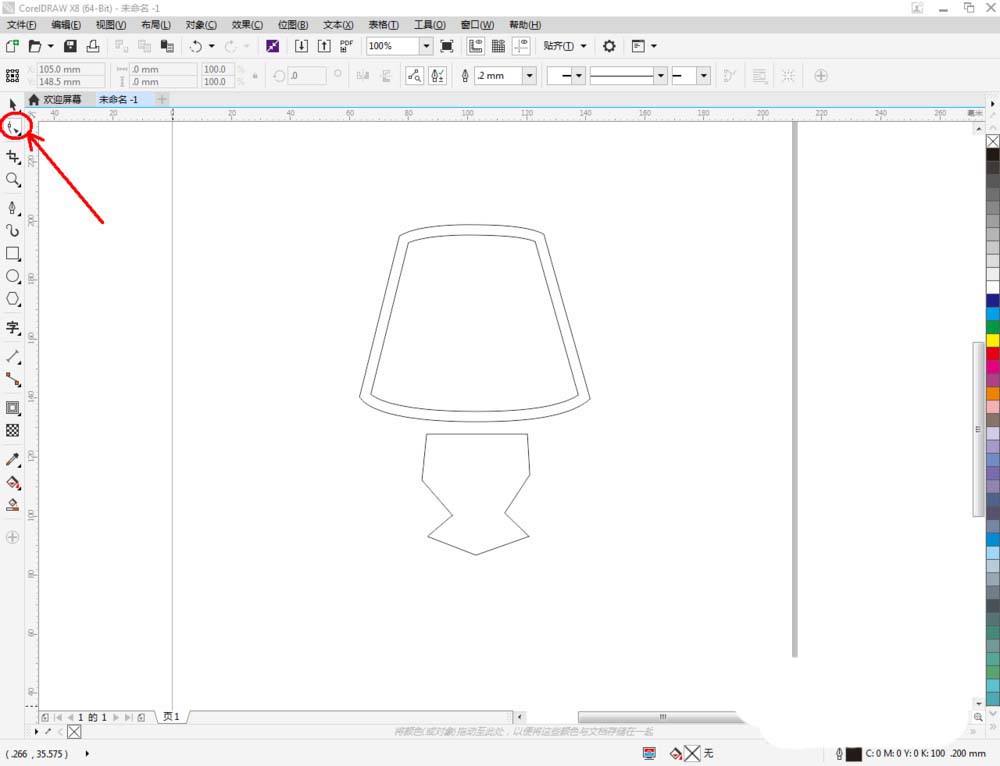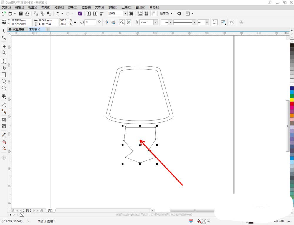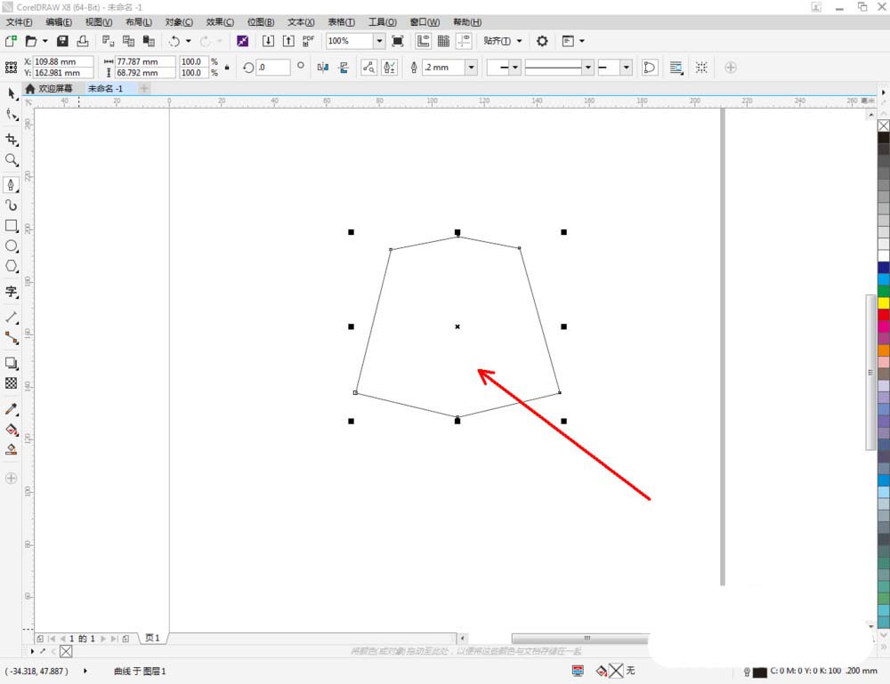 2、点击【钢笔工具】按图示在作图区域绘制出一个多边图案。点击【形状工具】,框选所有的节点后,点击【转化为曲线】将节点转曲。完成后,选中图示图案上的节点,点击【平滑节点】将节点进行平滑处理并调整好控制点(如图所示);