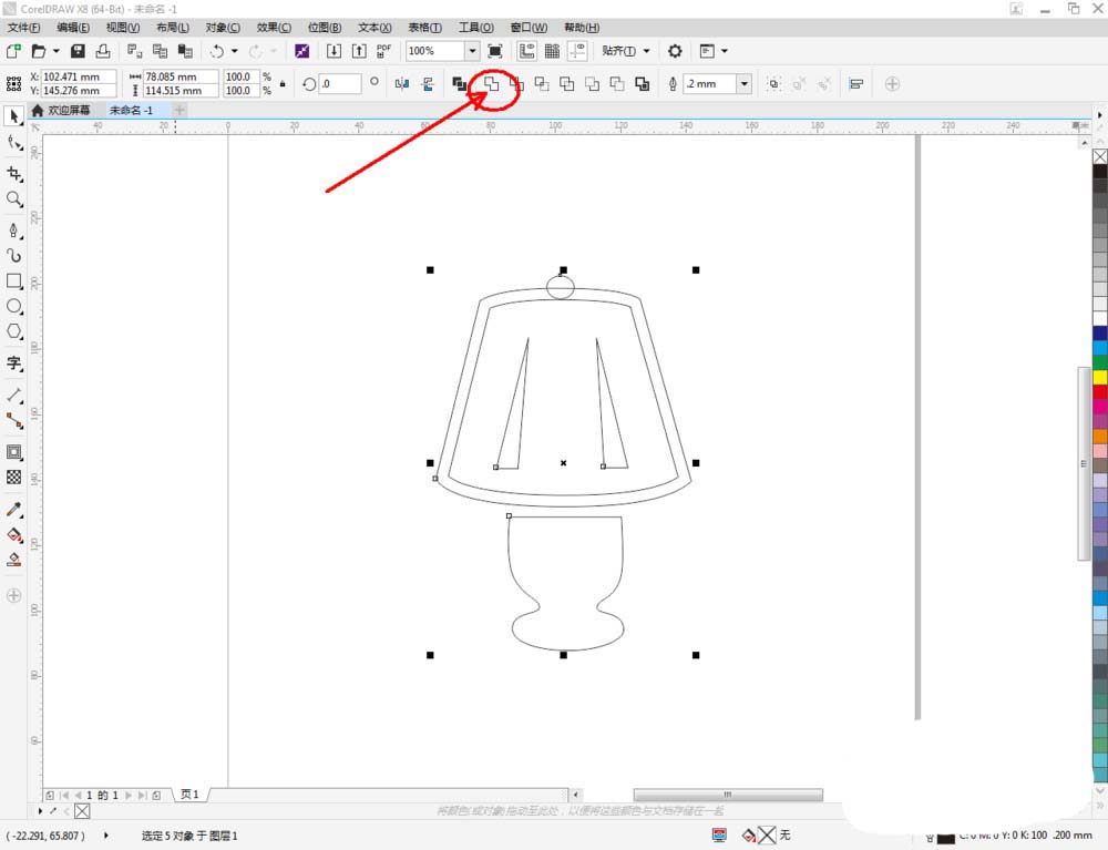 6、点击【选择工具】框选所有图案后,点击【合并】将所有图案合并为一体。选中图案,鼠标左键点击右边色板中的黑色,将图案填充为黑色,这样我们的台灯图标就全部制作完成了。