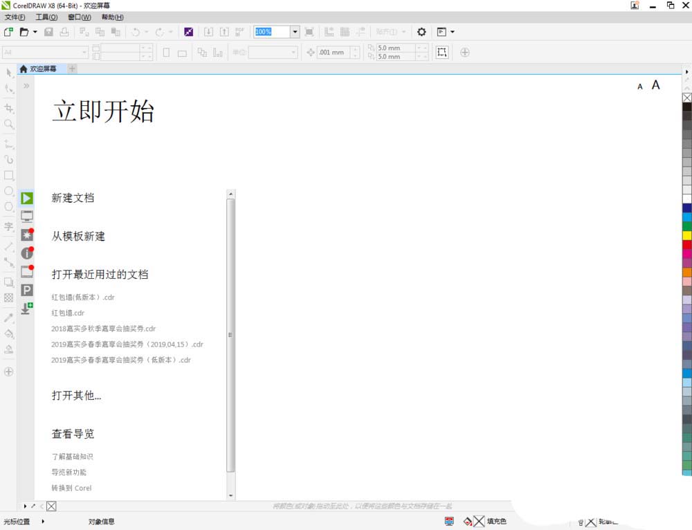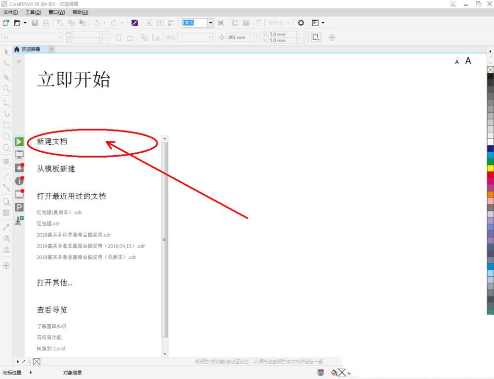 1、打开CorelDRAW X8 软件,点击【新建文档】,按图示参数新建一个cdr文档(如图所示);
