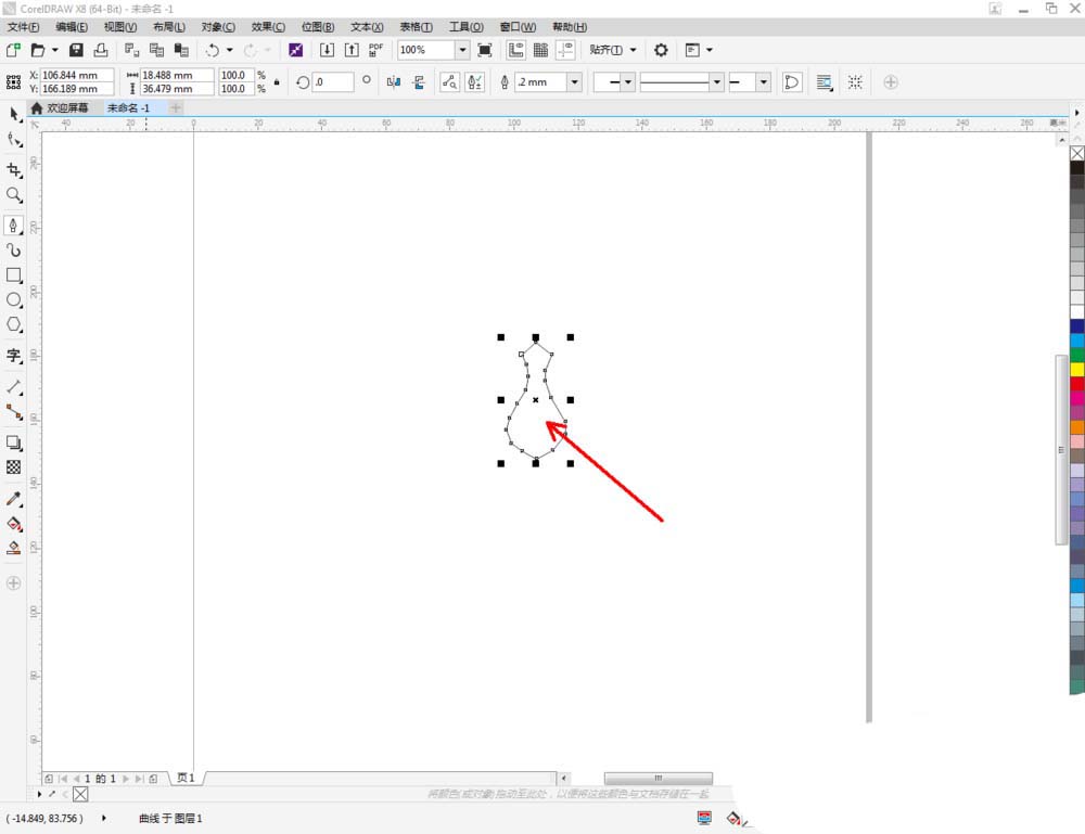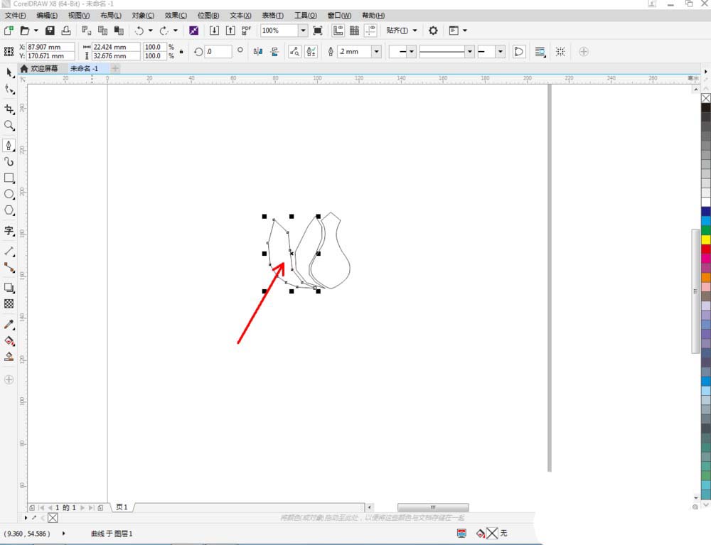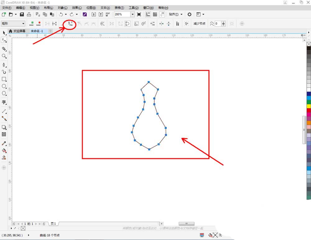 2、点击【钢笔工具】在图示区域绘制一个多边图案后,点击【形状工具】,框选图案上的节点,点击【转化为曲线】将节点转曲。完成后,选中图示图案上的节点,点击【平滑节点】将节点进行平滑处理并调整好控制点(如图所示);