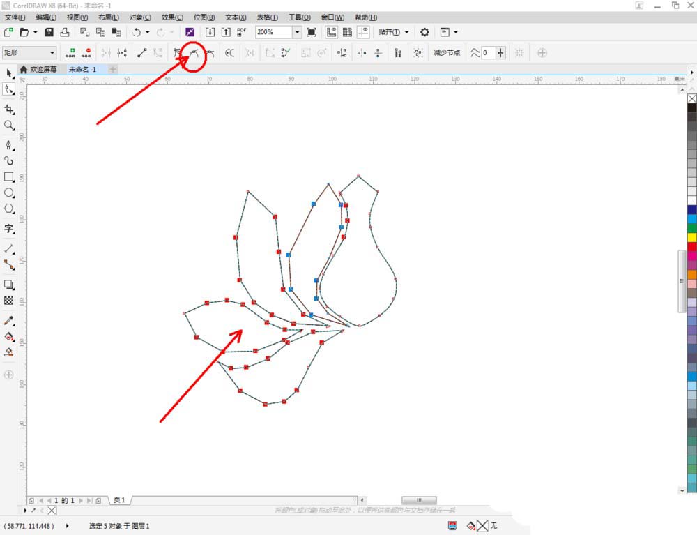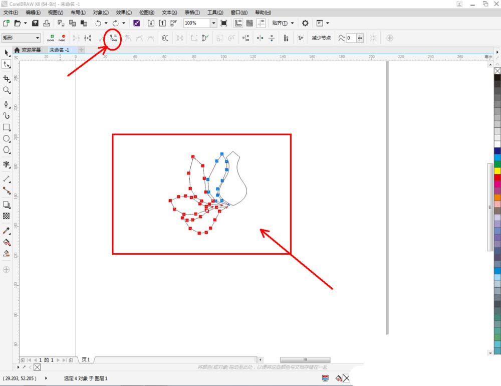 4、点击【形状工具】,框选图案上的节点,点击【转化为曲线】将节点转曲。完成后,选中图示图案上的节点,点击【平滑节点】将节点进行平滑处理并调整好控制点(如图所示);