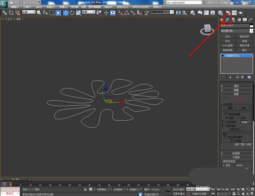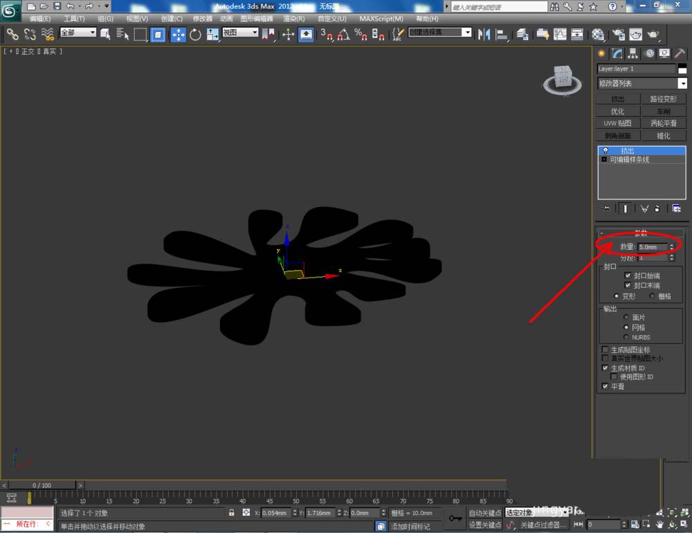 5、导入后的图案,我们可以对其直接进行建模操作。选中图案,点击【修改】-【挤出】,按图示设置好挤出数量并为其附上材质后,我们的图案模型就制作完成了。