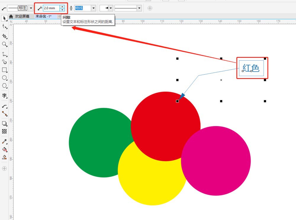 4、间隙:点击属性栏间隙可以调整文本和标注形状之间的距离。如下图,距离为2mm和5mm时效果。