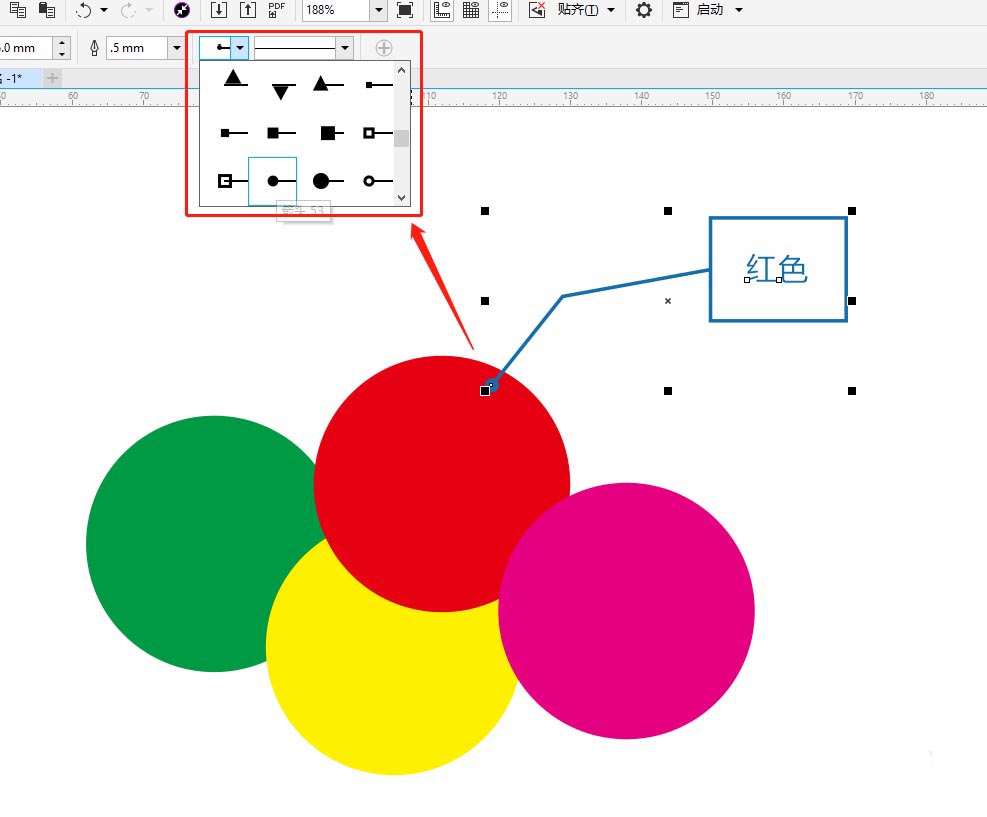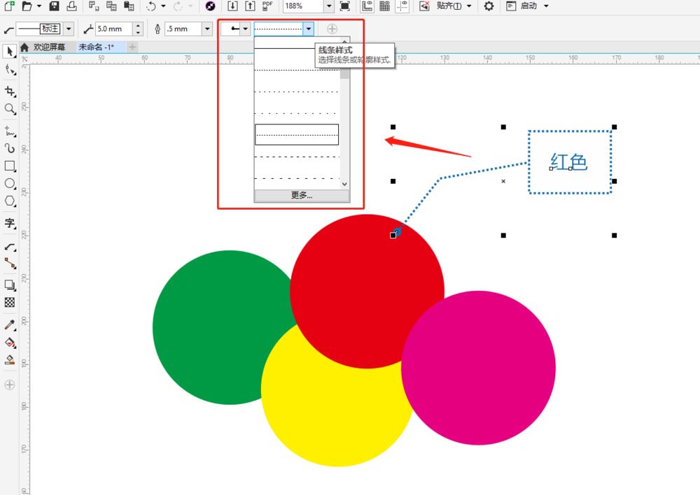 5、标注箭头和线条样式:在属性栏中可以选择各种剪头样式和线条样式。不同样式效果不同。如下图所示。