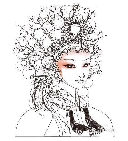 2、填充颜色,脸的部分可以选择使用网状填充工具,整体的明暗要划分好,暗面可以也用渐变填充和阴影工具来表现,发冠上的珠子和装饰建议先做出一个来,然后复制、调整,这样可以很快速的完成这繁琐的头饰。