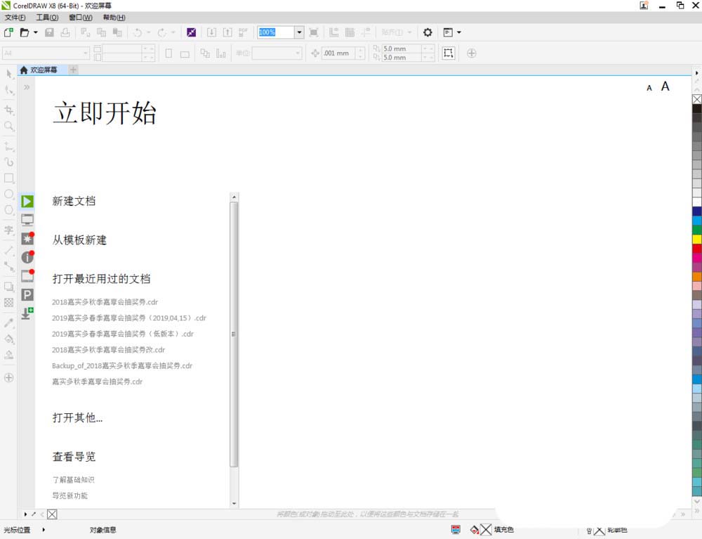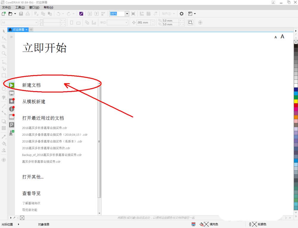 1、打开CorelDRAW X8 软件,点击【新建文档】,按图示参数新建一个cdr文档(如图所示);