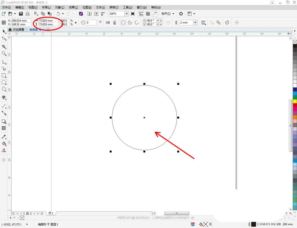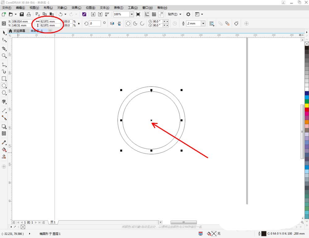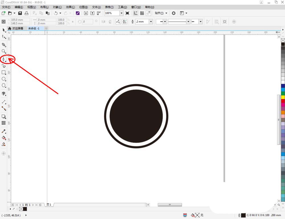 2、点击【椭圆形工具】,在作图区域绘制一大一小两个圆形图案。将小圆图案填充为黑色,大圆图案【轮廓宽度】设置为:2.5mm(如图所示);