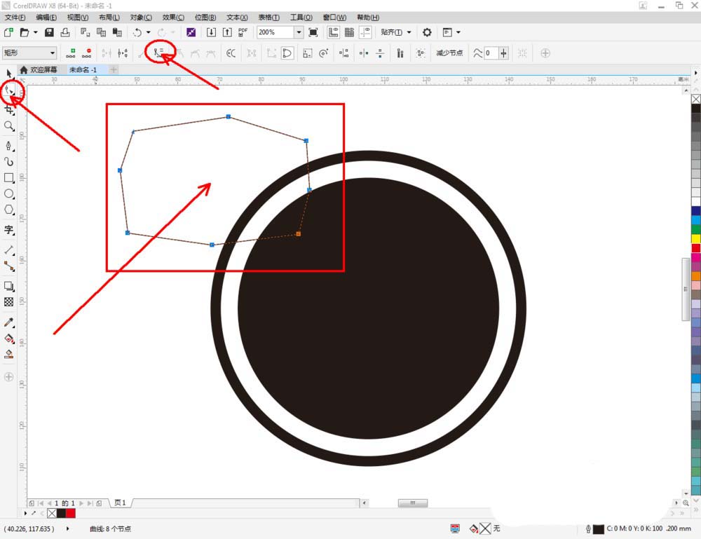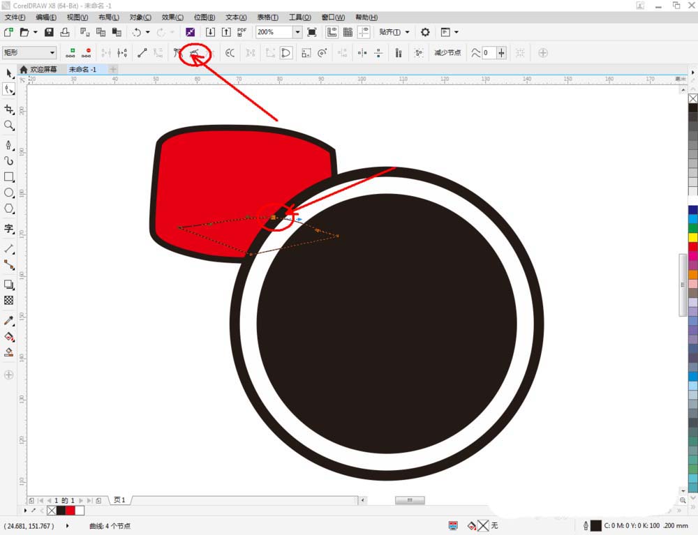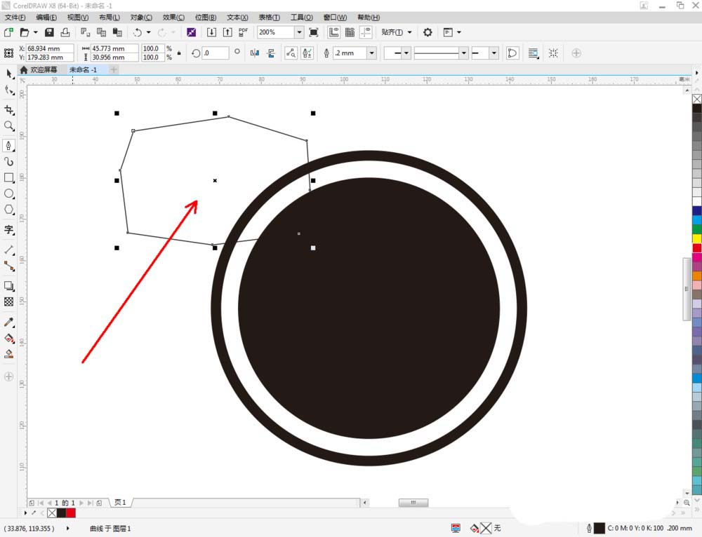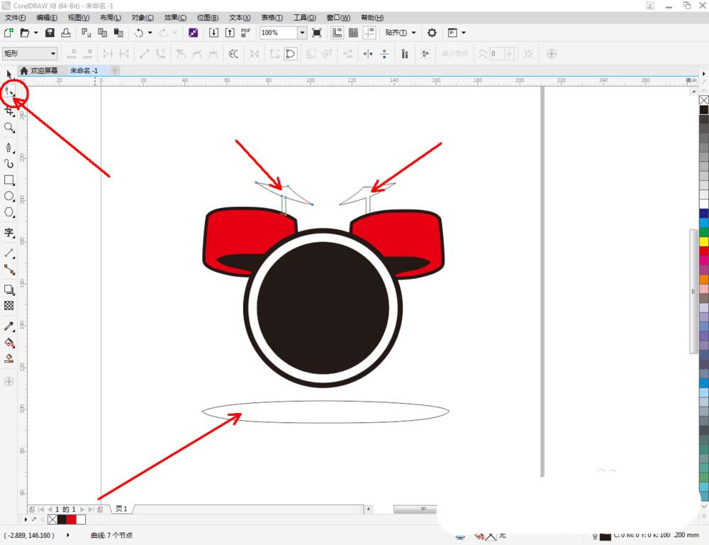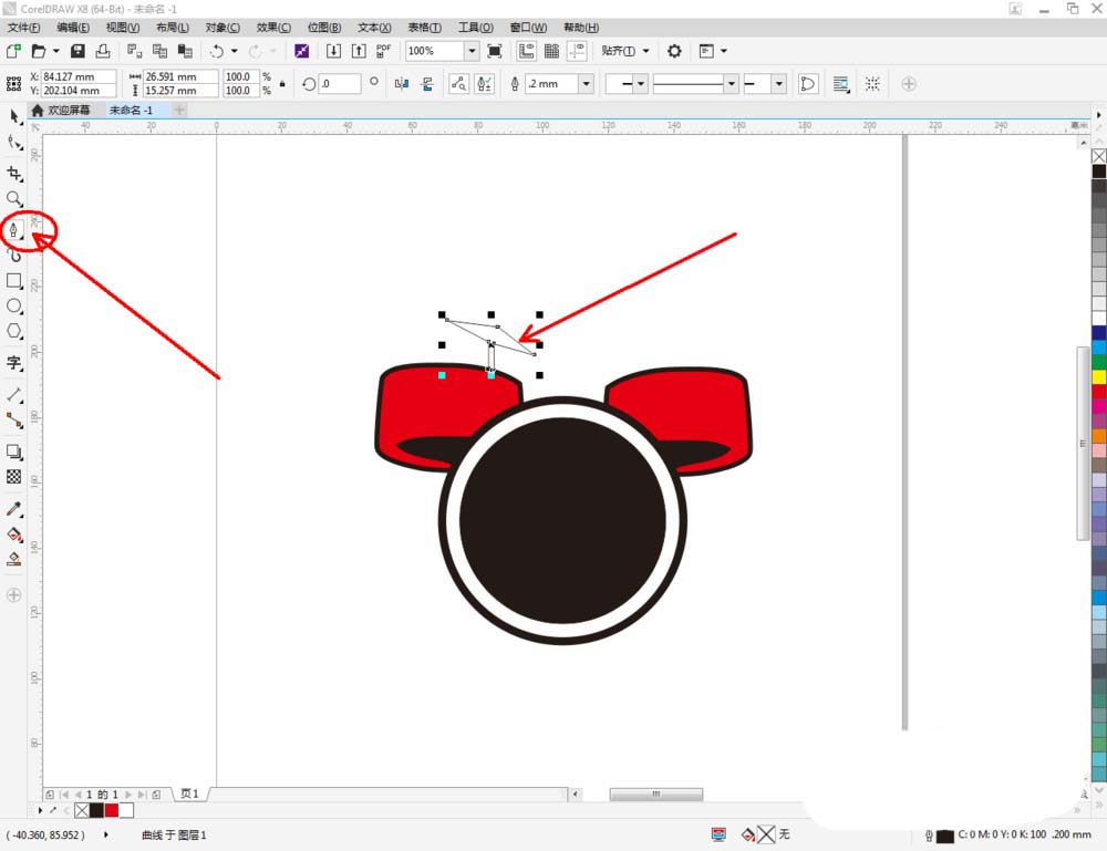 4、点击【钢笔工具】继续在作图区域绘制一个多变图案,完成图案上节点的平滑处理后,将图案填充为:黑色。完成后,同样将图案顺序调整至页面背面后(如图所示);