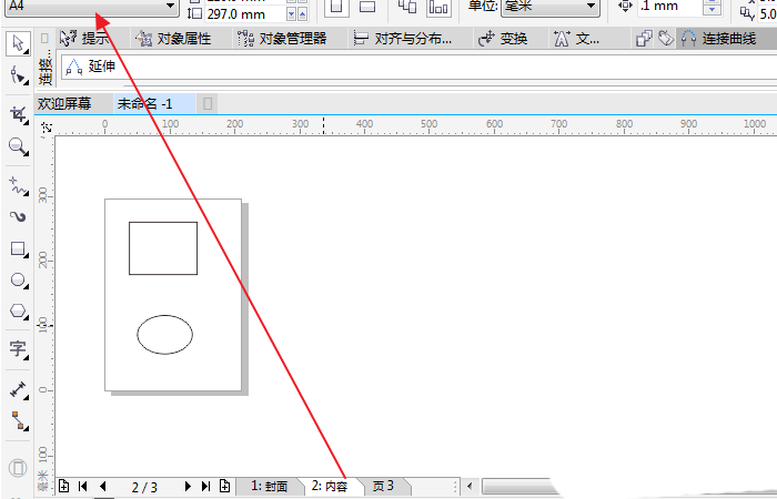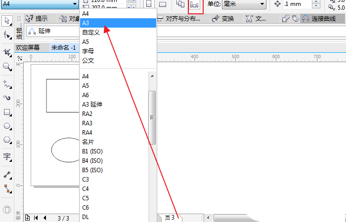 此外我们可以点击单位旁边的小图标,让页面的尺寸不一样,比如这里我们把复制的页改成A3纸大小的,而原来的页还是A4纸大小的,如图所示;