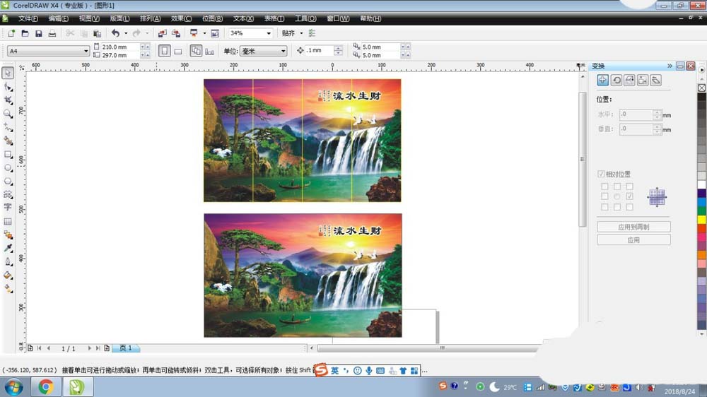 4、然后群组上面的四个小四方形,依次把下面的山水图片精确裁剪到四个小四方形里面,然后在取消群组,就可以把山水图形分割成四份。