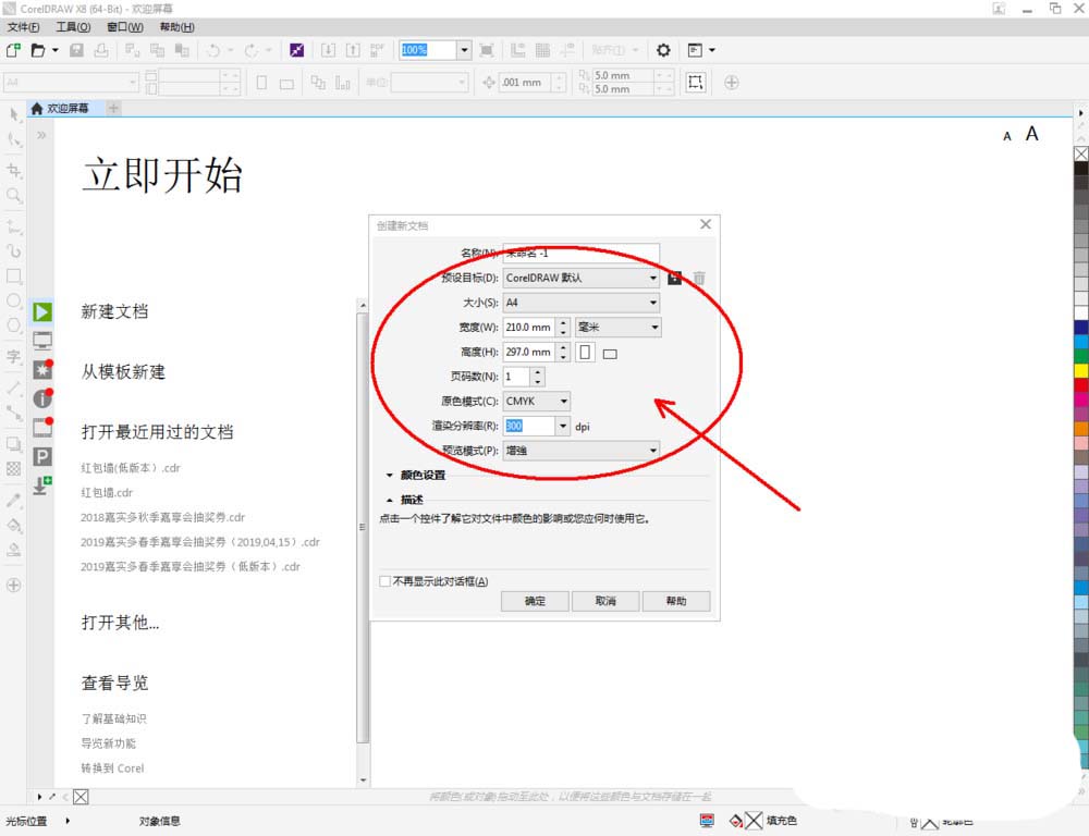 1、打开CorelDRAW X8软件,点击【新建文档】,按图示参数新建一个cdr文档(如图所示);