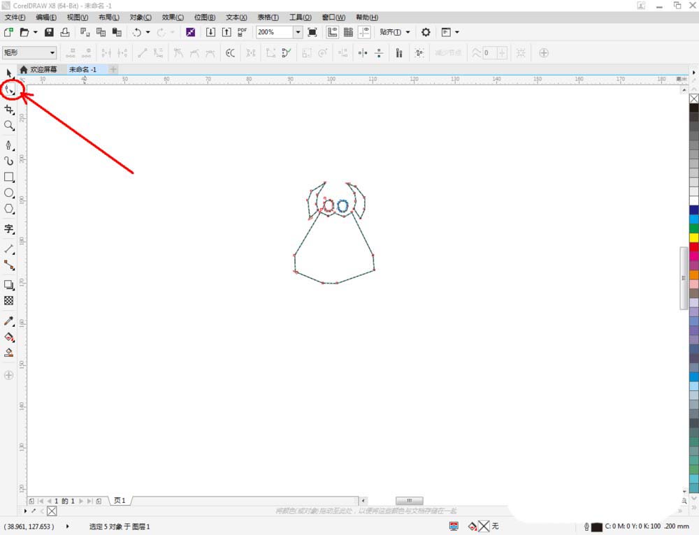 2、首先我们先对天蝎座头部进行绘制。点击【钢笔工具】,使用钢笔线段勾勒出头部的轮廓。点击【形状工具】,选中图案上的所有点,同样点击【转换为曲线】将图案转曲后,按图示调整控制点,完成整个头部图案的绘制(如图所示);