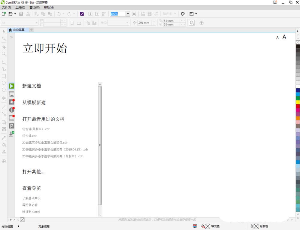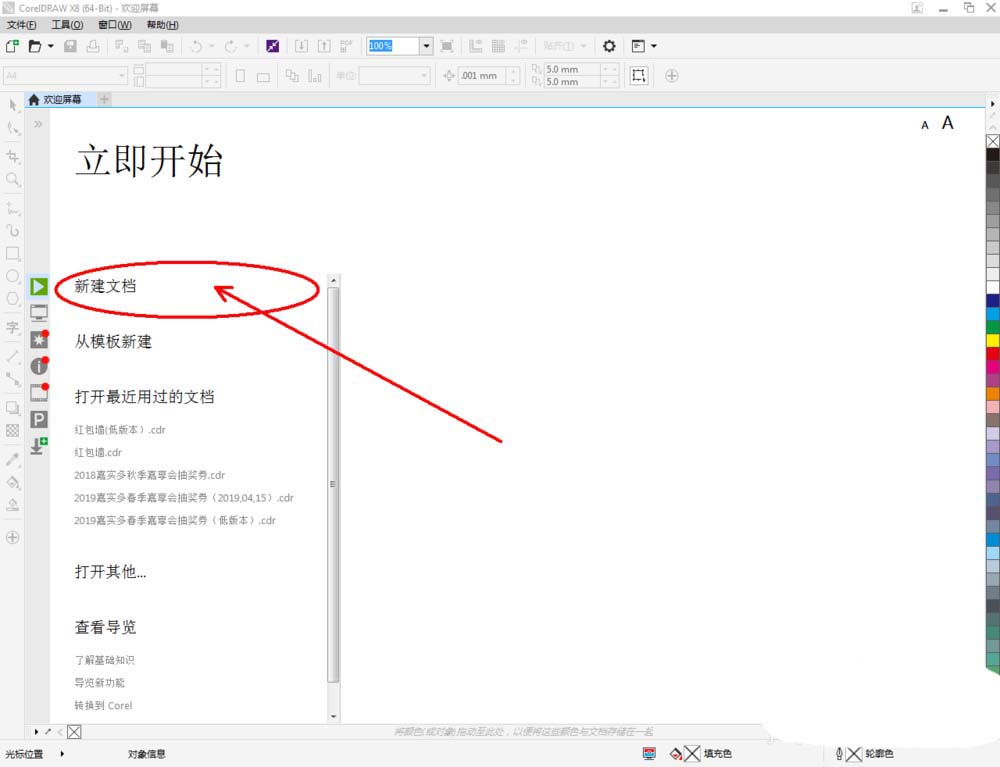 1、打开CorelDRAW X8 软件,点击【新建文档】,按图示参数新建一个cdr文档(如图所示);