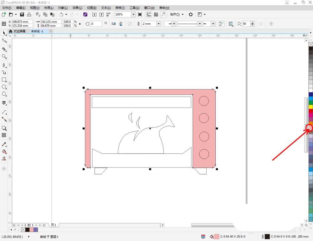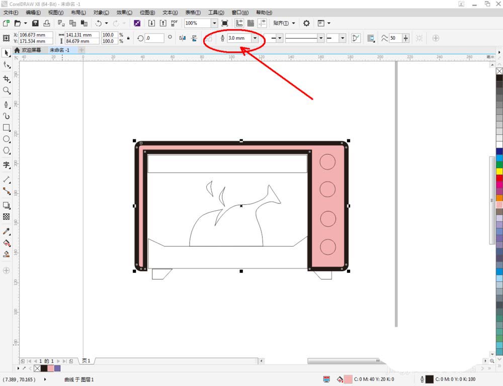 5、点击【选择工具】,选中主体图案,鼠标左键点击右边色板中的粉色色块将图案填充为粉色;鼠标右键点击黑色,将描边颜色设置为黑色,轮廓宽度设置为:3mm。同样的步骤,完成其他图案的颜色填充和描边设置后,我们的烤箱图案便全部制作完成。