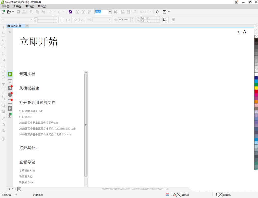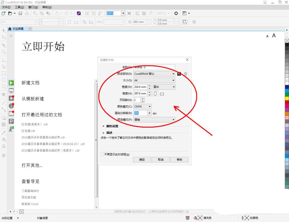 1、打开CorelDRAW X8 软件,点击【新建文档】,按图示参数新建一个cdr文档(如图所示);