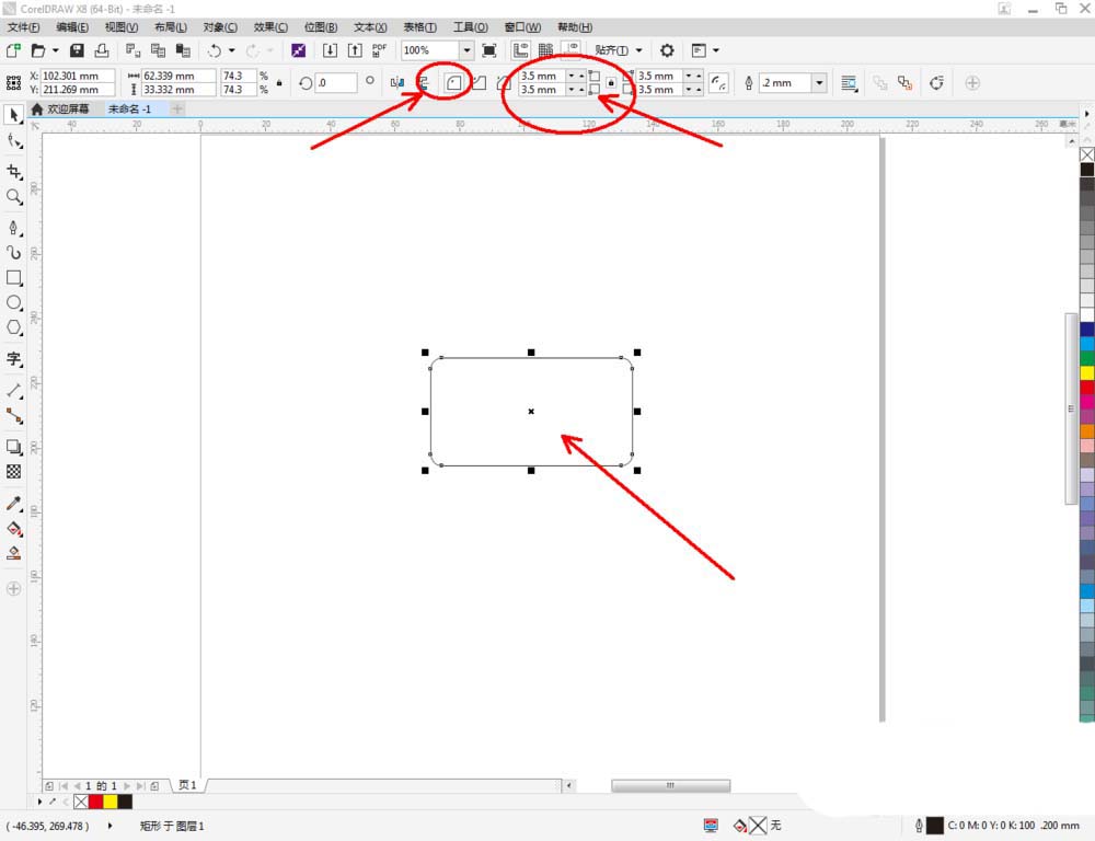 2、点击【矩形工具】,按图示设置好圆角的参数后,在作图区域绘制一个圆角矩形图案。完成后,按图示绘制出另外三个直角矩形图案(如图所示);