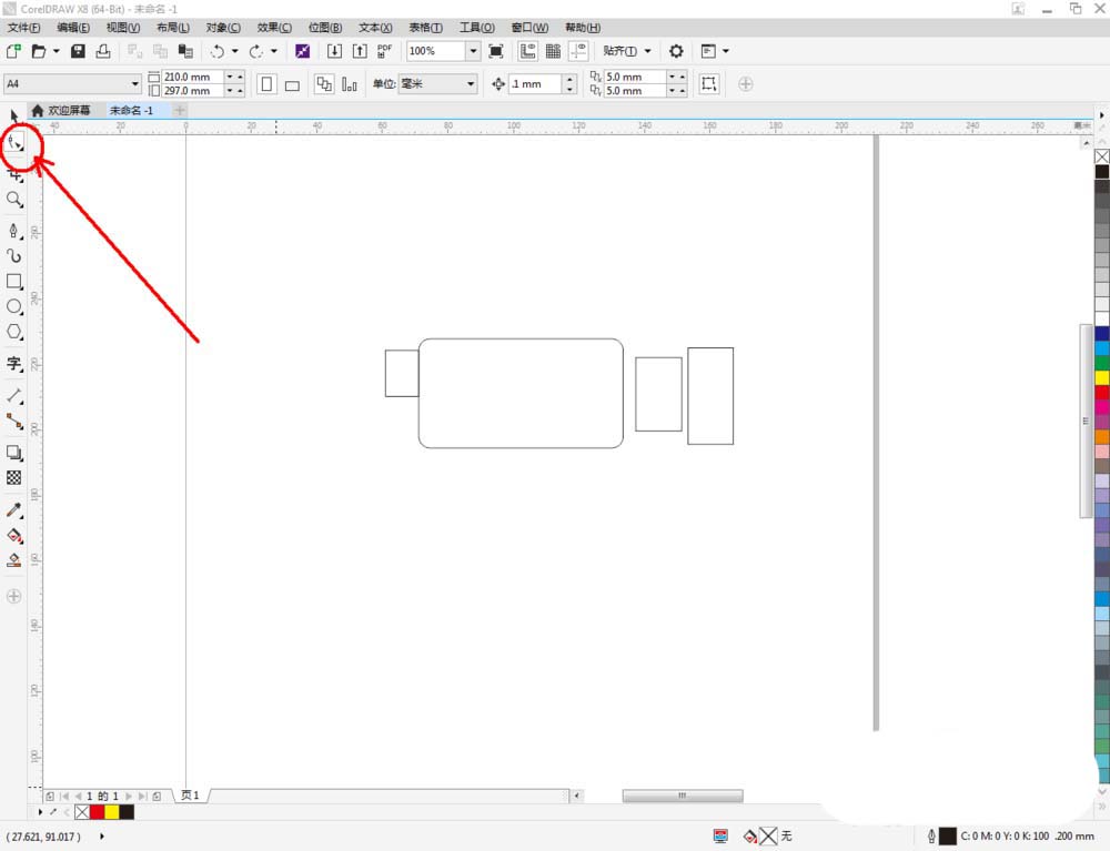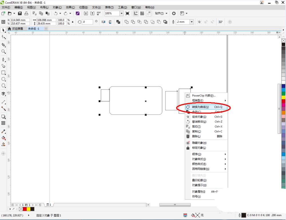 3、选中三个直角矩形图案,点击鼠标右键-【转化为曲线】将矩形转曲后,点击【变形工具】,按图示对图案上的节点进行位置调整(如图所示);