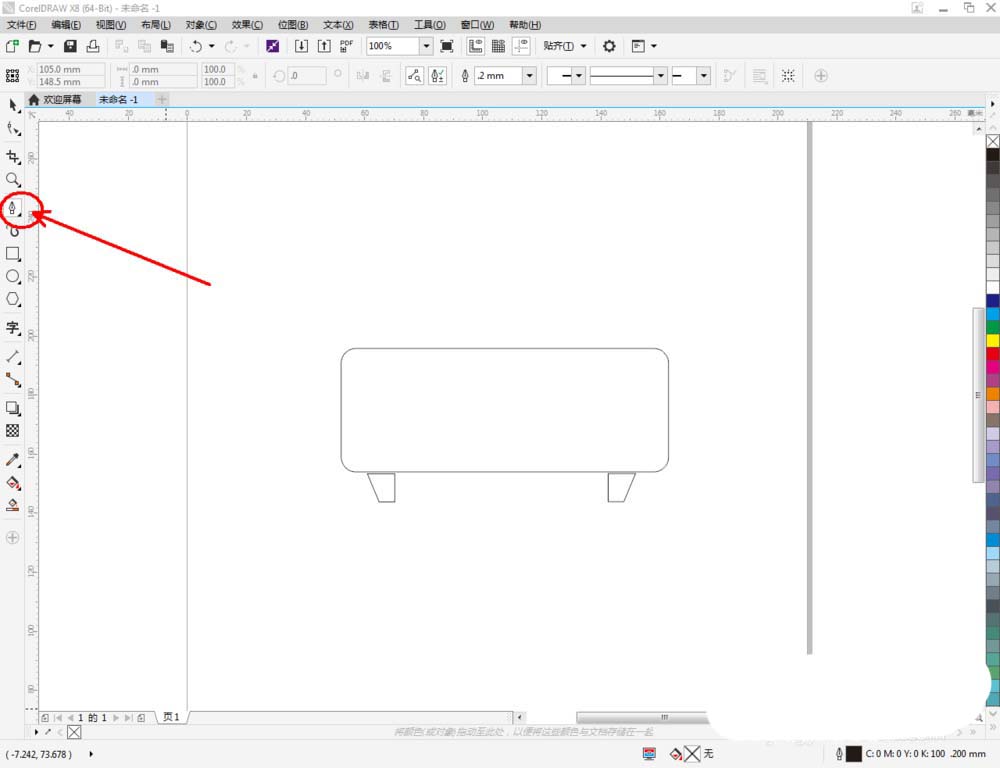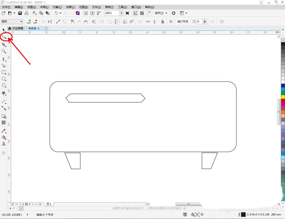 2、点击【矩形工具】,在作图区域绘制一个矩形图案,点击【圆角】图标,将圆角参数设置为:5。点击【钢笔工具】绘制一个多边图案作为投影仪的支撑脚。拉动复制一个图案副本后,点击【镜像】对图案进行镜像操作(如图所示);