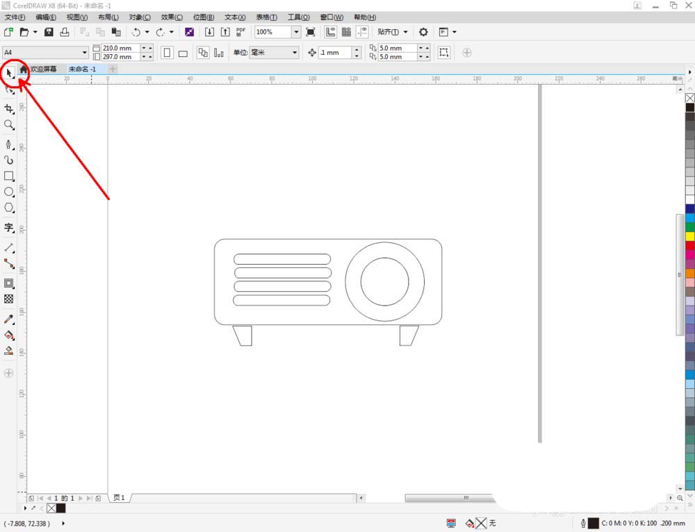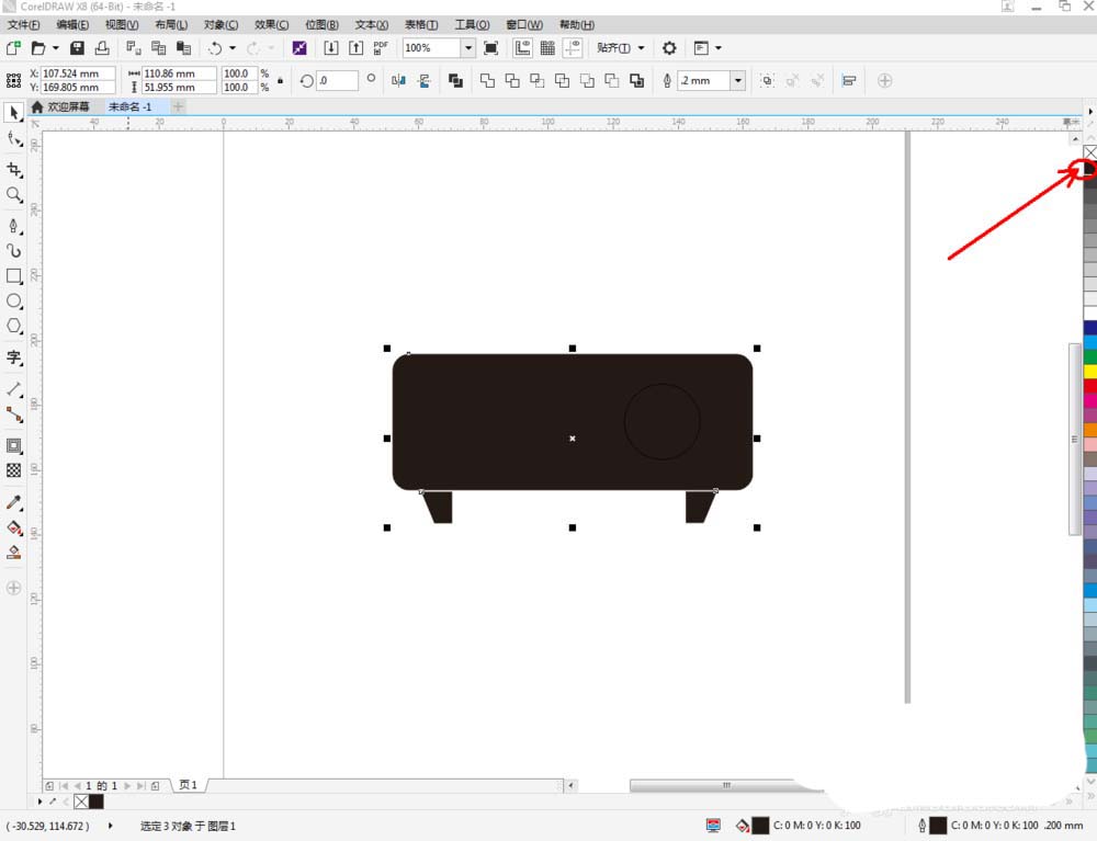 5、点击【选择工具】,按图示选中投影仪机身部分,鼠标左键点击右边色板中的黑色,将其填充为黑色。同样方式,完成其余部分图案颜色的填充后,我们的投影仪图标便制作完成了。