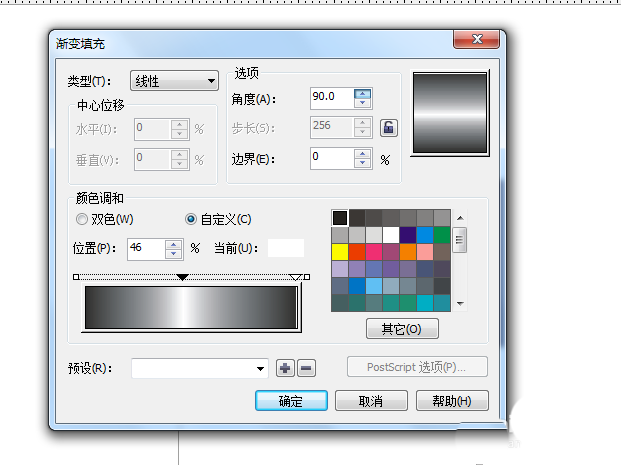 1、绘制一个矩形,然后进行渐变填充,选择射线,90度,调整颜色等。效果如下。