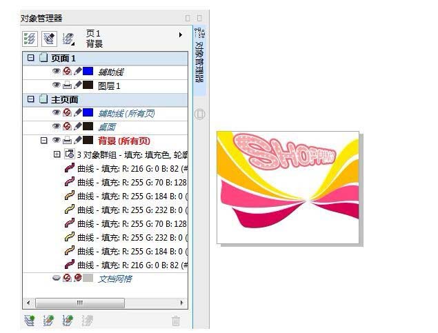6、在“对象管理器”泊坞窗中,单击“页面3”下的“图层1”,再按组合键Ctrl+V将对象粘贴到“页面3”的“图层1”中,如图所示