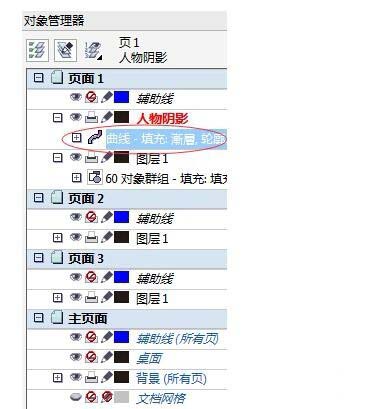 7、选中图层2和3,外围“页面2”和“页面3”创建“人物阴影”图层,并将阴影图层曲线对象移到该图层上