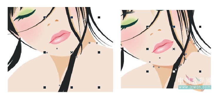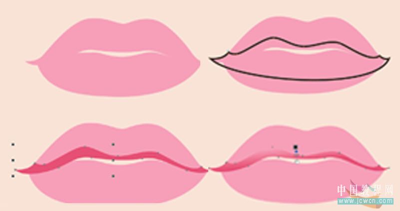 用修整中的相交命令、交互式调和工具等修出嘴巴的暗调与高光,制作流程如下图所示