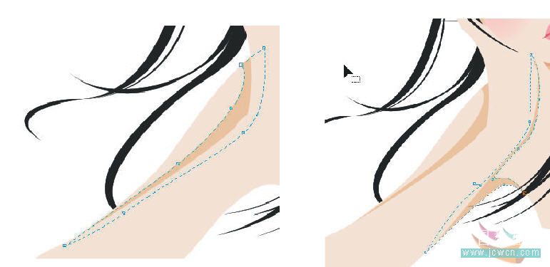 首先,使用曲线类工具绘制MM的鼻梁,填充颜色(C10、M20、Y30、K0)并去除轮廓。然后再点击工具箱中的“交互式透明工具”,从左向右拖曳鼠标,产生如下图所示的透明效果