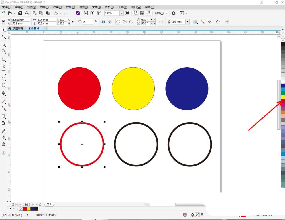 3、另外复制三个图案,并将外框线条参数设置为:2mm。选中圆形图案,鼠标右键点击右边色板中的色块,给外框线条设置不同的颜色(如图所示);