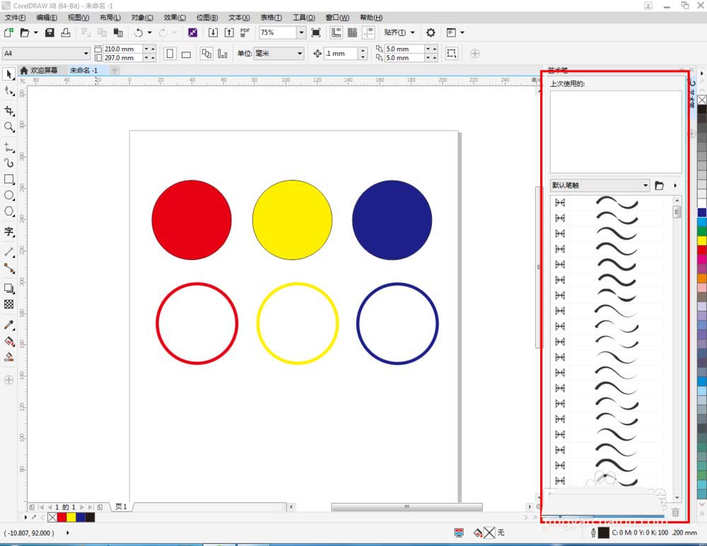 4、点击【效果】-【艺术笔】,将艺术笔选择栏调出并放置在右边工作区域。选中三个圆形外框图案,鼠标右键拉动图案至下方,点击【复制】绘制出另外三个图案;