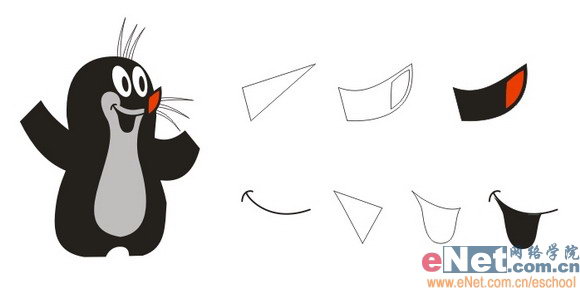 嘴巴:上唇由一长一短两条弧线组成,直接用贝塞尔工具画;下唇可先画一个三角形,转曲后调节圆滑。
