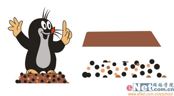 先画一个矩形,转曲后调节为如下形状,填充C:0 M: 60 Y: 60 K: 40,再画一些大小不一的小椭圆,分别填充黑色或者土黄色,杂乱的摆在一起形成小石子。