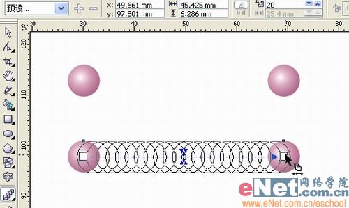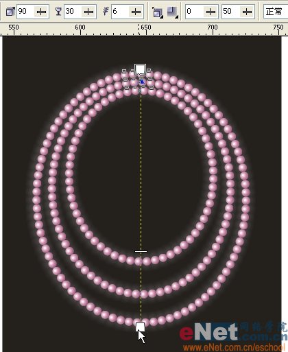 4、用椭圆工具画一个椭圆作为新路径。用交互式调和工具选中珍珠,在属性栏上点“新路径”,鼠标会变成弯曲的箭头状。
