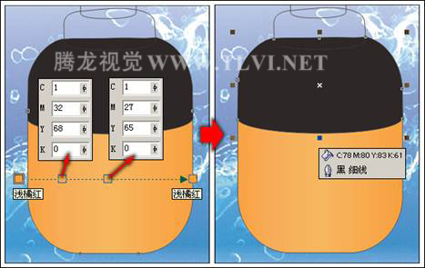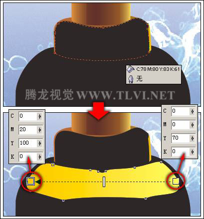 “交互式填充”工具,为香水瓶下半身图形填充渐变色。然后将香水瓶上半身图形填充为深褐色,如图12-95所示。
