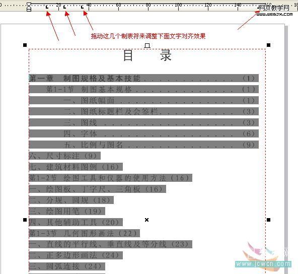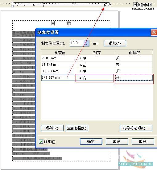 5、再打开制表位设置对话框,给最后一个制表符设置对齐和前导符。