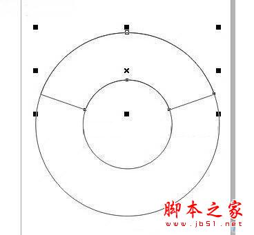 3.接下画就处理折扇手有的折熠,如图画一个等腰三角形,三角形的顶点要怡好在圆环的中心点,底边与扇边重合,然后用到旋转复制。角度和个数自己控制,填充白色,在把复制的物件群组,再用扇面去相交,得到如图